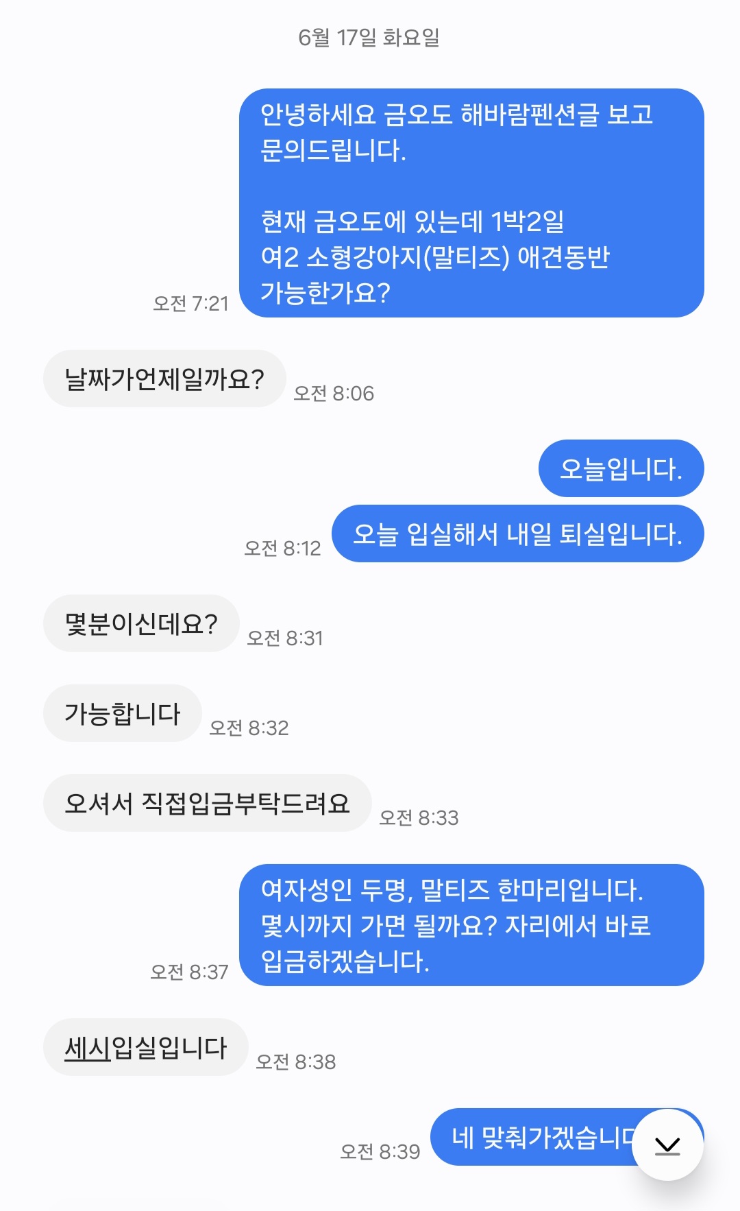 직접 문자 문의 드려보니 말티즈 한 마리는 가능하다고 흔쾌히 허락해 주셨어요.