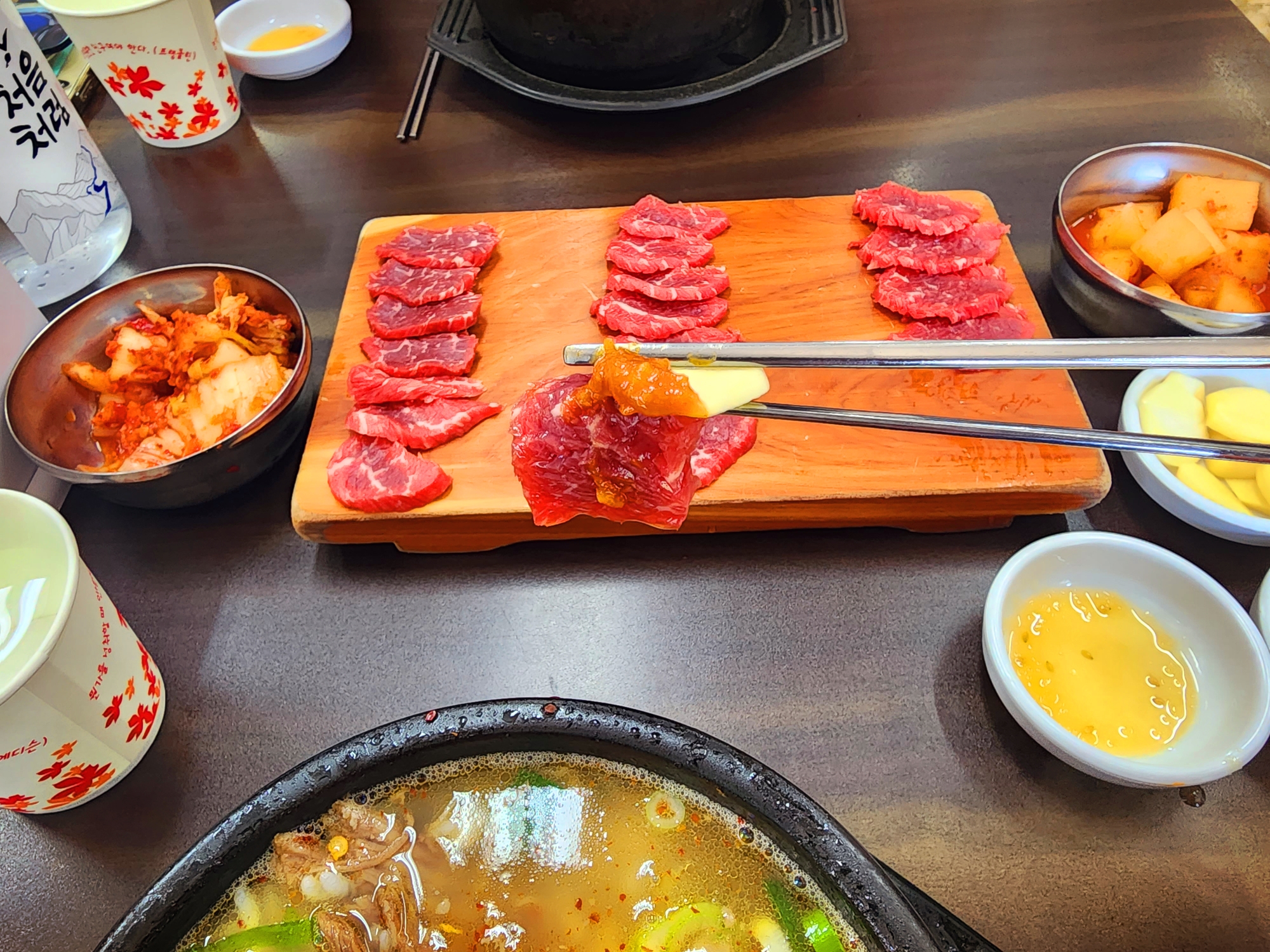 혼자 왔으면 국밥 한그릇 먹었겠지만, 둘이 왔으니 국밥에 한우 사시미 주문.